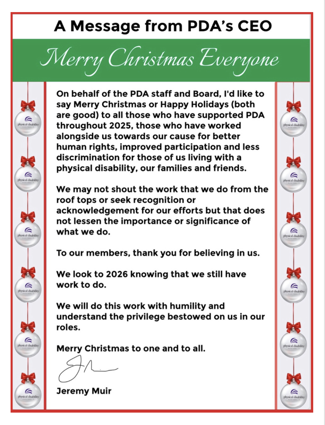 On behalf of the PDA staff and Board, I’d like to say Merry Christmas or Happy Holidays (both are good) to all those who have supported PDA throughout 2025, those who have worked alongside us towards our cause for better human rights, improved participation and less discrimination for those of us living with a physical disability, our families and friends.